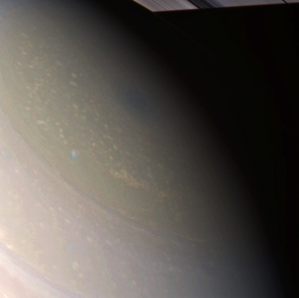 Cassini can’t get views of Saturn’s southern storm like this anymore as the south pole of the planet is now at nearly mid-winter and in seasonal shadow, and Cassini and its mission will be coming to an end in September. Until another spacecraft is sent there, these will remain some of our best—and last—views of the dark storm at Saturn’s south pole.