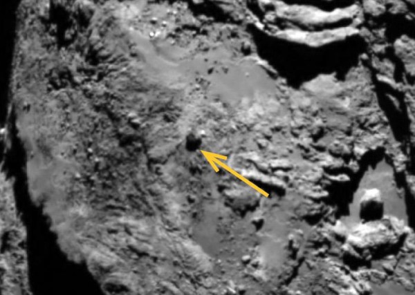See that big rock there? (It’s easy because there’s a big yellow arrow pointing to it.) That’s a 100-foot/30-meter wide boulder that was imaged sitting on the surface of Comet 67P/Churyumov-Gerasimenko by ESA’s Rosetta on May 2, 2015. Nine months later Rosetta captured another image of the same area in which that huge stone had clearly moved—find out below just how far!