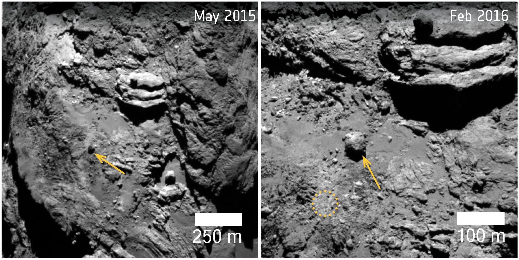 The two images above were taken by Rosetta’s high-resolution OSIRIS camera on May 2, 2015 and Feb. 7, 2016. The second image shows the region from closer-up, and in it the boulder has rolled about 460 feet (140 meters)!