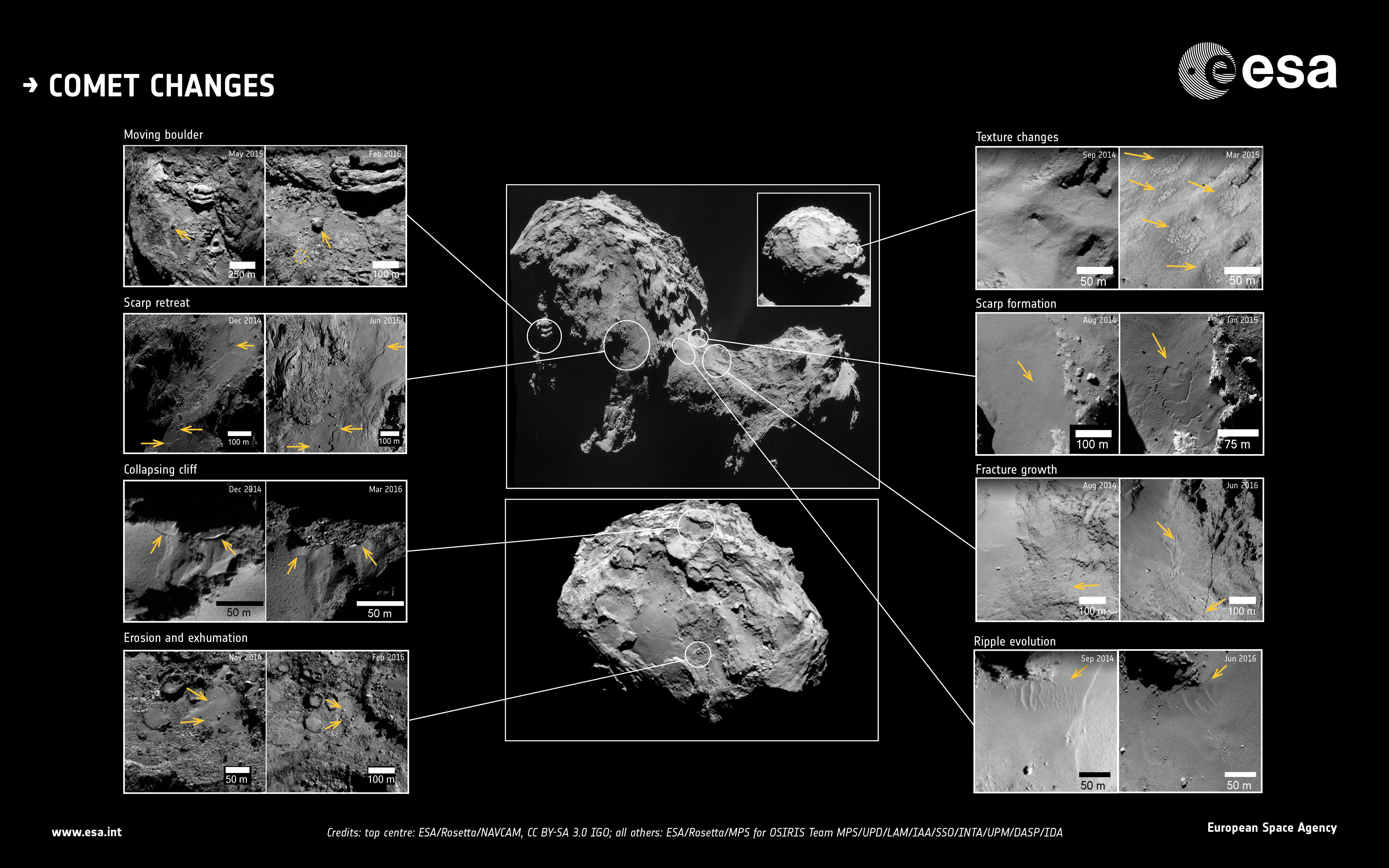 Changes observed on Comet 67P/C-G by ESA’s Rosetta mission. Credits: Top center images: ESA/Rosetta/NAVCAM, CC BY-SA 3.0 IGO; all others: ESA/Rosetta/MPS/UPD/LAM/IAA/SSO/INTA/UPM/DASP/IDA