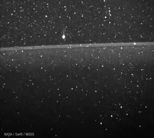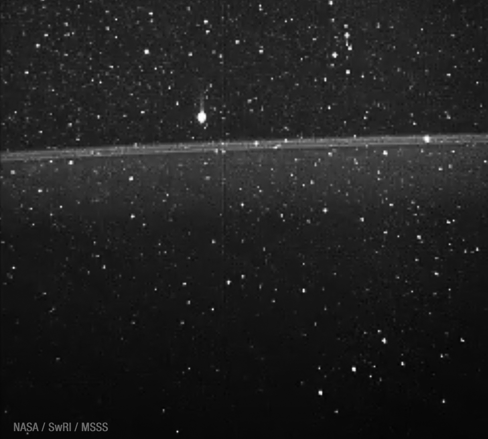 One of the fascinating pieces of data presented during the teleconference was the image below, showing Jupiter’s main ring against a background of stars—which just happens to be the upper half of the well-known constellation Orion. The bright star in the center is Betelgeuse, Orion’s right shoulder. It’s the first time Jupiter’s ring has ever been imaged from inside the system, looking outward!