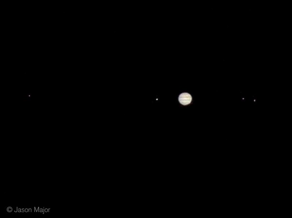 On this night in 1610 the Pisan astronomer Galileo Galilei looked up at a bright Jupiter at opposition through his handmade telescope and noted three little “stars” next to it, piquing his natural scientific curiosity. Further observations over the next few nights showed that the planet wasn’t moving relative to the little “stars” as it would have if they were indeed background stars. In fact the smaller objects (of which he soon saw four) were moving along with Jupiter, each in its own little path. He realized that the little objects weren’t stars at all but rather moons orbiting the giant planet—and, most importantly, not the Earth. This revelation helped change our entire view of the Solar System… and caused no end of trouble for Galileo as the Church didn’t appreciate a restructuring of their conveniently Earth-centered Universe. But it also opened the door for later discoveries of many more moons around other planets.