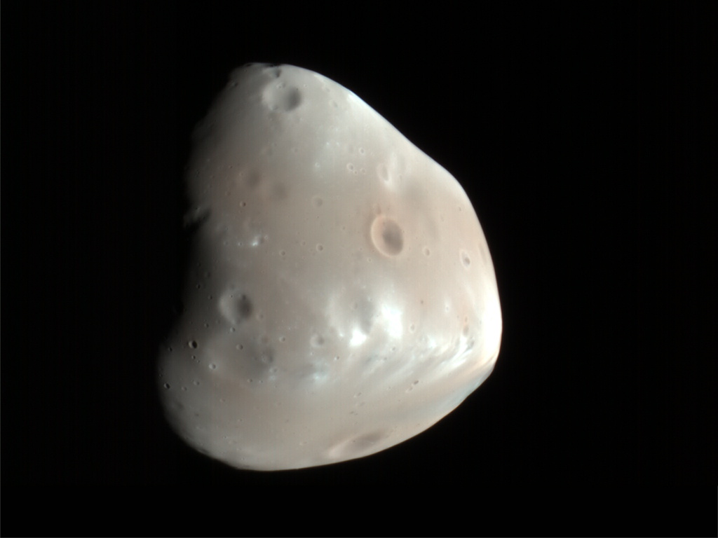 Mars isn’t a planet well-known for its natural satellites but it actually does have two small moons. The larger, Phobos, is an irregularly-shaped, heavily grooved and cratered world only about 17 miles (27 km) across at its widest. But Phobos has an even smaller companion: Deimos, which at 7.5 miles across is less than half Phobos’ size.
