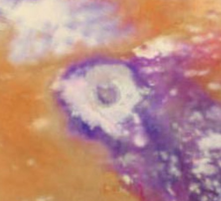 Any full color image is comprised of three color channels: red, green and blue. Each of the three color channels combined to create these views was produced using a ratio between the brightness of Titan’s surface at two different wavelengths (1.59/1.27 microns [red], 2.03/1.27 microns [green] and 1.27/1.08 microns [blue]). This technique (called a “band-ratio” technique) reduces the prominence of seams, as well as emphasizing subtle spectral variations in the materials on Titan’s surface. For example, the moon’s equatorial dune fields appear a consistent brown color here. There are also bluish and purplish areas that may have different compositions from the other bright areas, and may be enriched in water ice. (Source: NASA)