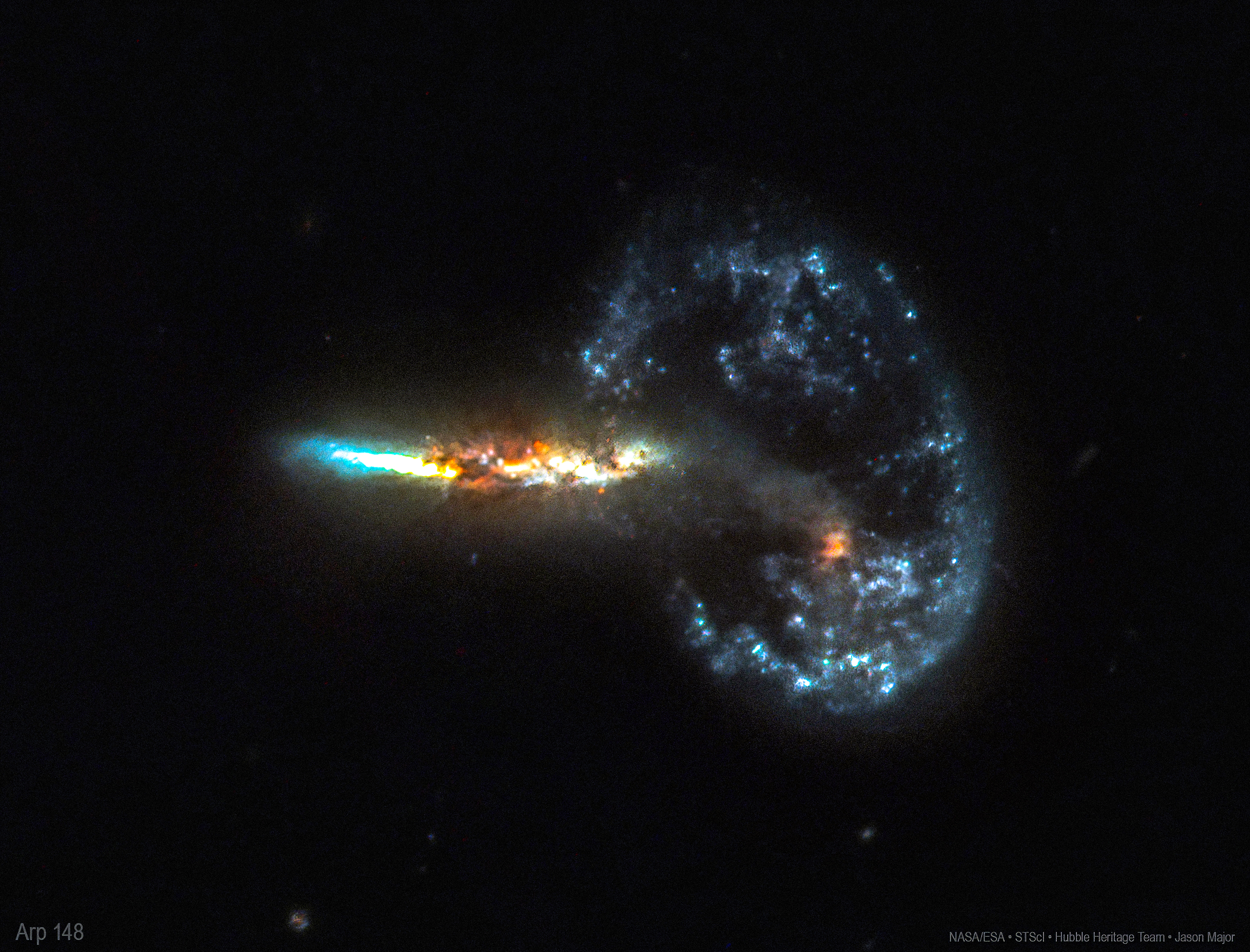 Arp 148 was discovered by American astronomer Nicholas U. Mayall of the Lick Observatory on March 13, 1940, using the Crossley reflector. When first discovered, Mayall’s Object was described as a peculiar nebula, shaped like a question mark. (Wikipedia)