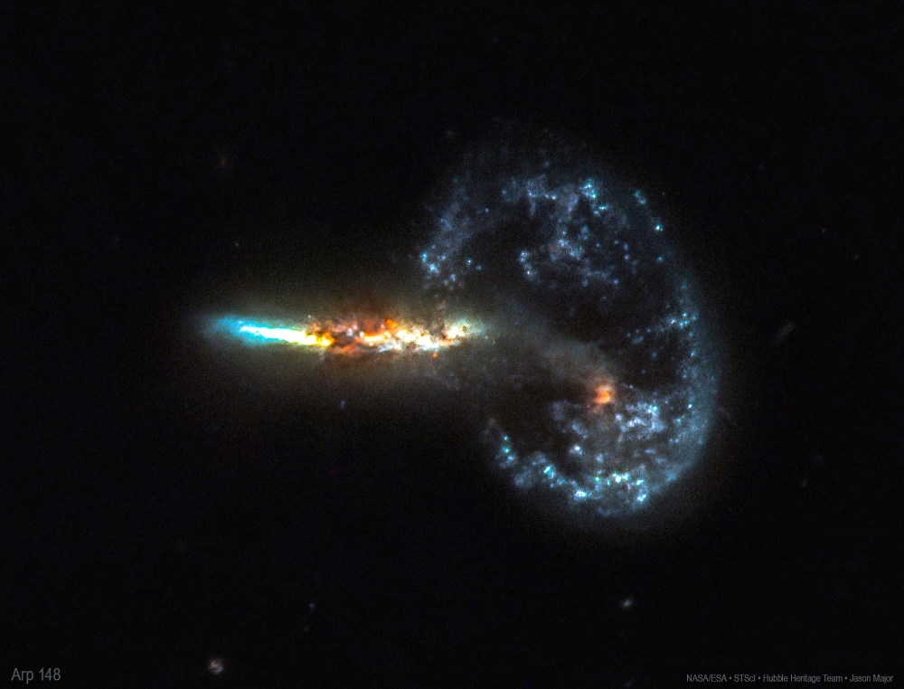 Arp 148 is the staggering aftermath of an encounter between two galaxies, resulting in a ring-shaped galaxy and a long-tailed companion. The collision between the two parent galaxies produced a shockwave effect that first drew matter into the centre and then caused it to propagate outwards in a ring. The elongated companion perpendicular to the ring suggests that Arp 148 is a unique snapshot of an ongoing collision. Infrared observations reveal a strong obscuration region that appears as a dark dust lane across the nucleus in optical light.